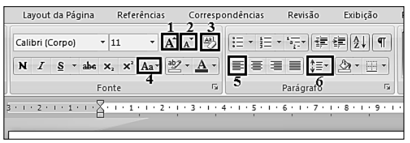A figura abaixo ilustra um fragmento de tela da área de trabalho do Microsoft Word 2007 (idioma Português) com algumas regiões destacadas e numeradas de 1 a 6.