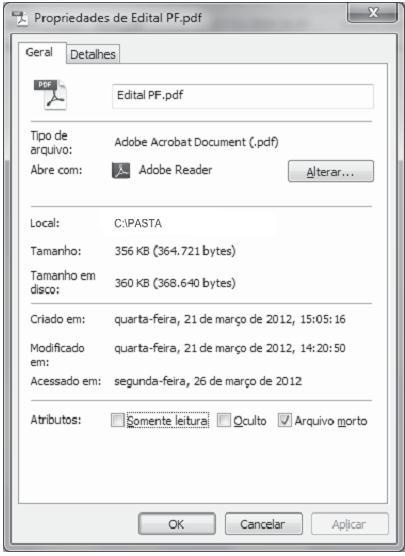 A figura acima apresenta as propriedades básicas de um arquivo em disco, no sistema operacional Windows. A respeito da figura, julgue os itens a seguir.