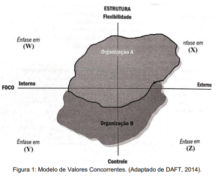 O “Modelo de Valores Concorrentes” combina duas dimensões que dão origem a quatro abordagens para eficácia organizacional, sendo extremamente útil ao gestor na análise de diversos aspectos organizacionais, tais como a estrutura, o planejamento, a liderança, o desempenho etc. Estas dimensões são: foco (um contínuo cujos extremos são “interno” e “externo”); e estrutura (um contínuo cujos extremos são “flexibilidade” e “controle”). Note que o gráfico tem como eixos essas duas dimensões e seus quadrantes representam as abordagens de eficácia, que na figura estão nomeadas como “ênfase em (W)”, “ênfase em (X)”, “ênfase em (Y)” e “ênfase em (Z)”.