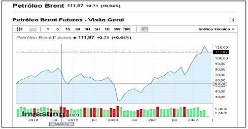 ( ) De acordo com o gráfico, constata-se que o preço do barril tipo Brent bateu suas mínimas no início da pandemia do coronavírus e sua máxima com início do conflito no leste europeu entre Ucrânia e Rússia, sendo que neste período houve acréscimo da mínima de U$ 22,00 para U$ 122,00, representando acréscimo de 455%.