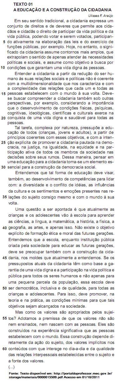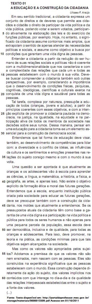 “Tal tarefa, complexa por natureza, pressupõe a educação de todos (crianças, jovens e adultos), a partir de princípios coerentes com esses objetivos, e com a intenção explícita de promover a cidadania pautada na democracia, na justiça, na igualdade, na equidade e na participação ativa de todos os membros da sociedade nas decisões sobre seus rumos.” (Linhas 23-29).