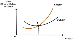 III. As duas curvas se cruzam no ponto A, onde a curva de custo médio no longo prazo atinge seu ponto máximo. No caso especial em que o CMeLP é constante, temos o CMeLP menor que o CMgLP.