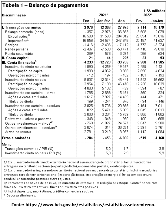 A partir das estatísticas do Balanço de Pagamentos do Brasil, disponibilizada pelo Banco Central, através de nota para imprensa em 29/04/2022, analise a tabela a seguir: