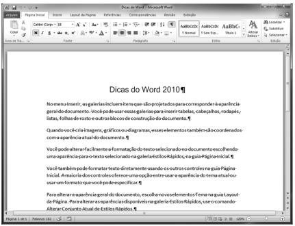 A figura acima ilustra uma janela do Word 2010 em um computador com o sistema operacional Windows 7, na qual foi aberto o documento Dicas do Word 2010. Com relação a essa figura e ao programa Word 2010, julgue o próximo item.
