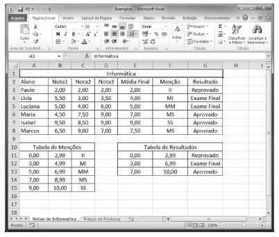 Os resultados apresentados nas células do segmento de coluna de F3 a F8 podem ter sido obtidos mediante a execução da seguinte sequência de operações: selecionar a região F3:F8 (deixando a célula F3 ativa); digitar a fórmula =PROCV(E3;$A$11:$C$15;3;FALSO); pressionar e manter pressionada a tecla