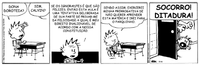 A partir dos argumentos apresentados pelo personagem Calvin na tirinha acima mostrada, julgue o seguinte item.