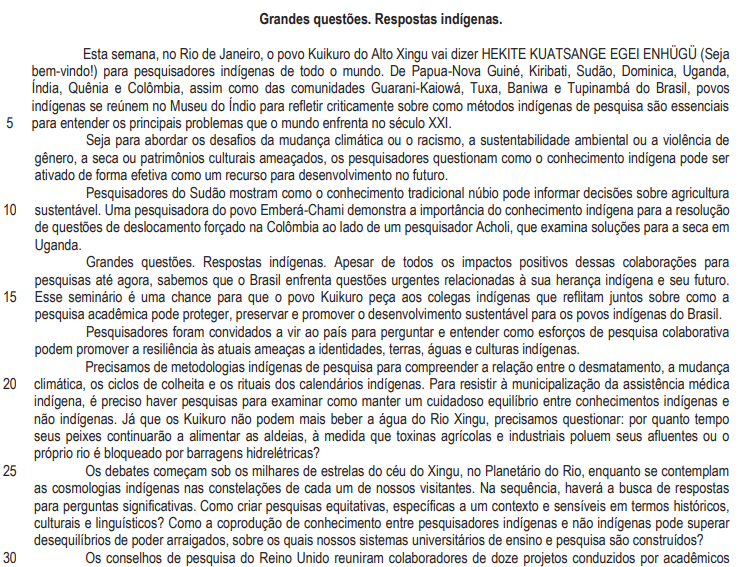 Já que os Kuikuro não podem mais beber a água do Rio Xingu, precisamos questionar: por quanto tempo seus peixes continuarão a alimentar as aldeias, à medida que toxinas agrícolas e industriais poluem seus afluentes ou o próprio rio é bloqueado por barragens hidrelétricas? (linhas 22 a 24).