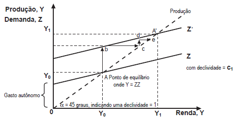 O aumento da demanda agregada, indicado pela passagem de Z a Z’, permite dizer que houve uma elevação do gasto autônomo, fazendo com que a economia passasse do equilíbrio no ponto A para outro equilíbrio no ponto A’, enquanto a trajetória para alcançar o novo equilíbrio permite concluir que o primeiro impacto sobre a renda, decorrente do aumento da demanda agregada, é representado pelo segmento Ab , sendo que o segmento bc representa o aumento do consumo autônomo, os segmentos cd e de completam essa trajetória até o novo equilíbrio em A’.