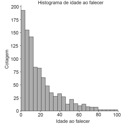 O Instituto de Geografia e Estatística de determinado país, interessado em estudar a expectativa de vida da população desse país, levantou dados sobre a idade ao falecer de uma amostra aleatória de pessoas já falecidas. O histograma a seguir consolida a distribuição desses dados.
