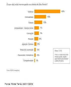 Uma pesquisa do Ibope encomendada pela ONG Movimento Nossa São Paulo, divulgada nesta quinta- feira, mostra uma lista do que mais desagrada o morador da capital paulista. O trabalho é parte das comemorações pelo aniversário de 455 anos de São Paulo, no próximo dia 25. A pesquisa ouviu 1.512 pessoas, de 18 a 29 de novembro de 2008, perguntando do que o entrevistado menos gosta ou o que mais o incomoda na cidade. O entrevistado deveria responder apenas um motivo; caso apresentasse mais de um defeito, apenas o primeiro seria computado. A margem de erro é de três pontos percentuais para mais ou para menos. Confira os índices no infográfico abaixo: