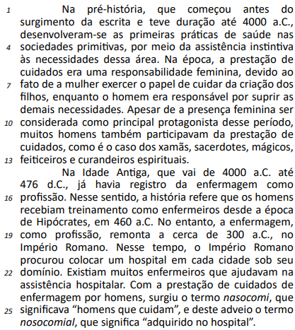 Considerando as ideias do texto e sua estrutura linguística, julgue o item a seguir. Quando a enfermagem surgiu como profissão, os homens já recebiam treinamento como enfermeiros há mais de um século.