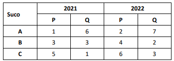 Na tabela, P = preço em R$ e Q = quantidade em milhões de caixas. Tomando o ano de 2021 como base, e se baseando nos índices de Laspeyres correspondentes, as variações dos preços e das quantidades vendidas dos sucos entre 2021 e 2022 são, respectivamente, iguais a
