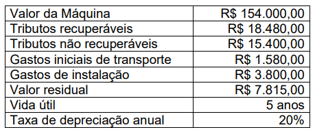 Uma sociedade empresária adquiriu uma máquina para uso, cuja data de início de operações foi em 01/07/2018, sobre a qual apresentou as seguintes informações: