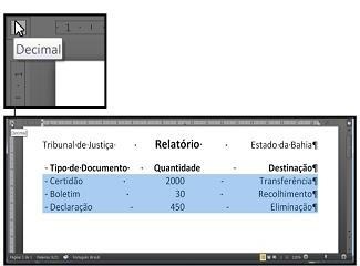 No MS Word 2010 BR, é possível alinhar textos em diversas posições na mesma linha utilizando tabulações. Elas podem ser definidas rapidamente clicando no seletor de tabulação na extremidade esquerda da régua até que ela exiba o tipo de tabulação desejado. No documento ilustrado na figura a seguir, a