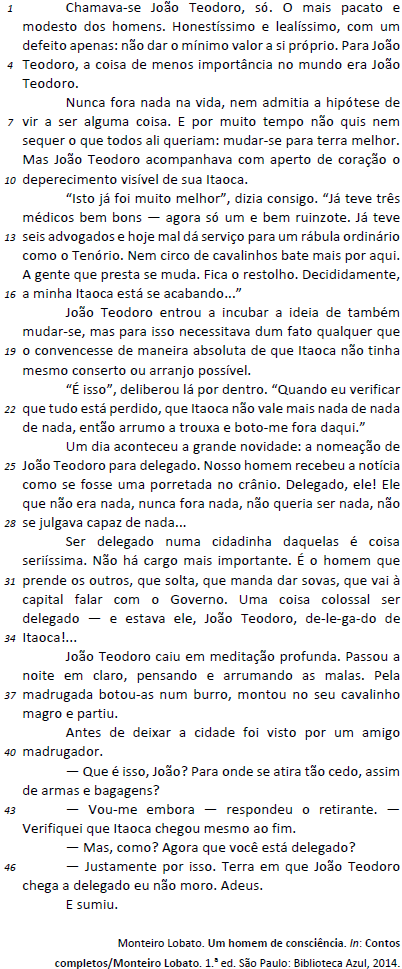 O parágrafo constituído pelo trecho “Ser delegado numa cidadinha daquelas é coisa seriíssima. Não há cargo mais importante. É o homem que prende os outros, que solta, que manda dar sovas, que vai à capital falar com o Governo. Uma coisa colossal ser delegado — e estava ele, João Teodoro, de-le-ga-do de Itaoca!” (linhas de 29 a 34) marca o momento em que João Teodoro decide deixar Itaoca, por verificar que não estava à altura de um cargo tão importante como o de delegado.