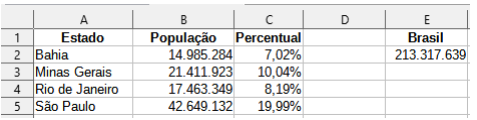 Considerando que o intervalo de células C3:C5 recebeu uma cópia da fórmula e do formato da célula C2 para calcular o percentual da população de cada estado em relação à população do Brasil, que está na célula E2 , o conteúdo da célula C2 deveria ser: