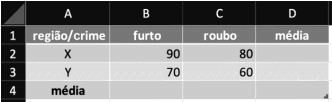 Caso deseje, com base nesses dados, obter a média de todos os crimes, independentemente da região onde eles foram cometidos, e inseri-la na célula D4, o usuário deverá utilizar a seguinte fórmula.