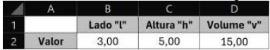 Sabe-se que“v” é o volume do objeto, “l” a medida do lado da base quadrada e “h” a altura da pirâmide. Nesse contexto, o usuário criou uma planilha, informando os valores para “l” e “h” e inserindo a fórmula na célula D2, conforme ilustrado a seguir: