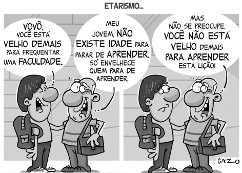 O Texto 1 mostra de que maneira o etarismo se apresenta em nossa sociedade, por exemplo,