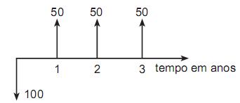 O diagrama de fluxo financeiro abaixo apresenta o pagamento e os recebimentos associados a um projeto de investimento com a duração total de três anos. As setas para cima indicam que o investidor recebe as quantias escritas junto às setas; a seta para baixo indica o pagamento pelo investidor da quantia escrita junto à seta.