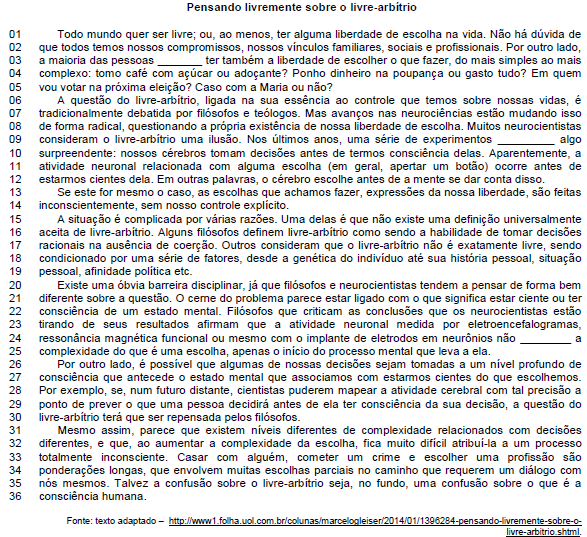 Analise as afirmações que são feitas sobre as estratégias argumentativas empregadas no texto. I. O autor apresenta a tese defendida por neurocientistas na primeira frase, explicando-a no próximo período. II. No início do último parágrafo, o autor antecipa um possível contra-argumento à tese da não existência do livre-arbítrio. III. No decorrer de todo o texto, o autor se utiliza de exemplos concretos, específicos da realidade brasileira, sobre violência, para demonstrar que o livre-arbítrio existe na realidade. Quais estão corretas?