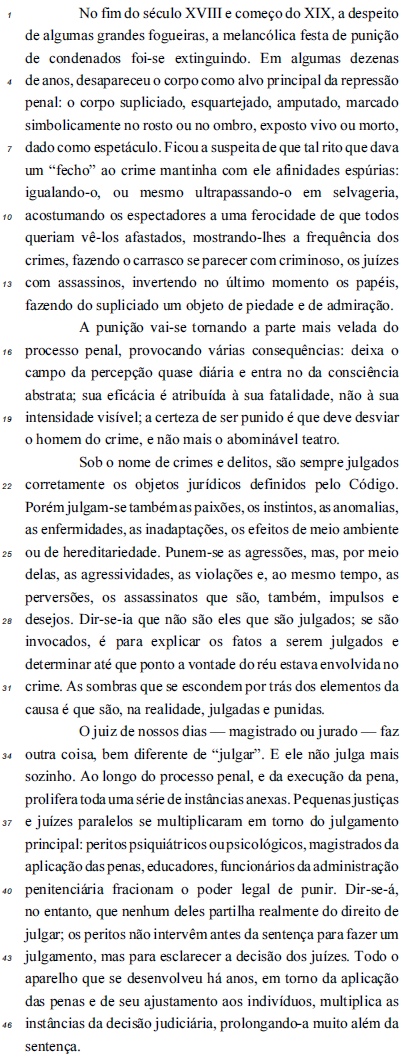 O autor do texto reflete sobre a evolução histórica da justiça: a punição de condenados, que, de início, ocorria mediante dores físicas passou, a partir dos princípios do século XIX, a ter caráter mais moral, submetendo os réus a sofrimentos mais sutis, mais velados.
