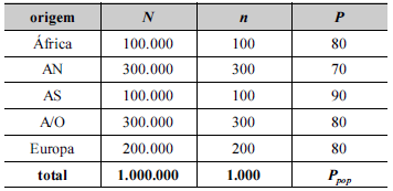Uma pesquisa realizada com passageiros estrangeiros que se encontravam em determinado aeroporto durante um grande evento esportivo no país teve como finalidade investigar a sensação de segurança nos voos internacionais. Foram entrevistados 1.000 passageiros, alocando-se a amostra de acordo com o continente de origem de cada um — África, América do Norte (AN), América do Sul (AS), Ásia/Oceania (A/O) ou Europa. Na tabela seguinte, N é o tamanho populacional de passageiros em voos internacionais no período de interesse da pesquisa; n é o tamanho da amostra por origem; P é o percentual dos passageiros entrevistados que se manifestaram satisfeitos no que se refere à sensação de segurança.