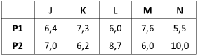 Cinco pessoas cujos nomes têm as iniciais J, K, L, M e N fizeram as duas provas necessárias para concorrer ao cargo de gerente de uma empresa. As provas foram duas, P1 e P2, com peso 2 para a primeira e peso 1 para a segunda. As notas dos candidatos estão na matriz abaixo.