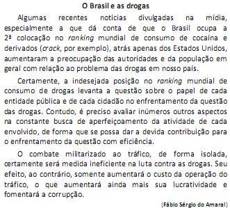 "Algumas recentes notícias divulgadas na mídia, especialmente a que dá conta de que o Brasil ocupa a 20colocação no ranking mundial de consumo de cocaína e derivados (crack, por exemplo), atrás apenas dos Estados Unidos, aumentaram a preocupação das autoridades e da população em geral com relação ao problema das drogas em nosso país".