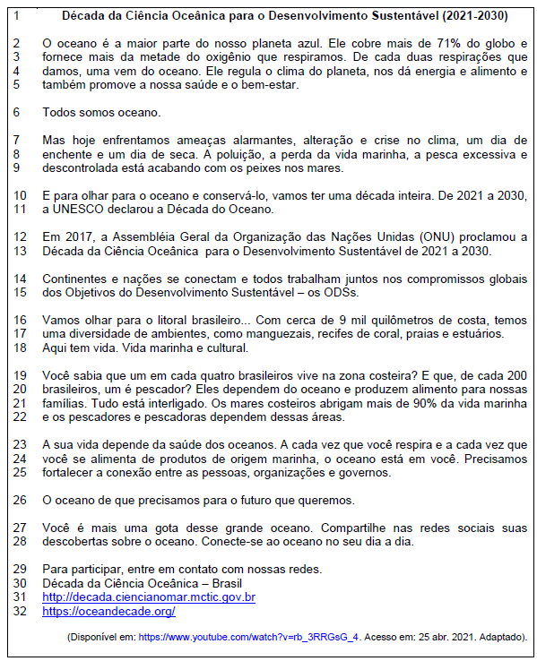 No trecho “Compartilhe nas redes sociais suas descobertas sobre o oceano. Conecte-se ao oceano no seu dia a dia. Para participar, entre em contato com nossas redes” (linhas 27-29), as expressões destacadas “Compartilhe”, “Conecte-se” e “entre em contato”, são