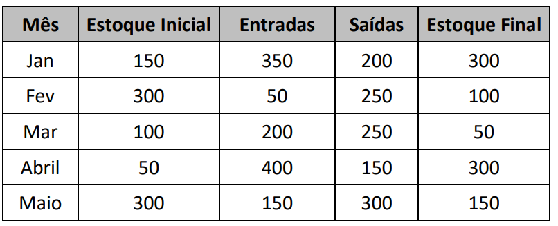 A gestão de estoques constitui uma série de ações que permitem ao administrador verificar se os estoques estão sendo bem utilizados, bem localizados em relação aos setores que deles se utilizam, bem manuseados e bem controlados. A tabela abaixo é utilizada pela empresa XYZ para controlar os seus estoques: