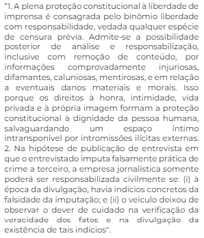 Em novembro de 2023, com o julgamento do Recurso Extraordinário (RE) 1075412, o STF definiu os critérios para responsabilização civil de empresas jornalísticas que publiquem entrevistas contendo atribuição falsa de prática de crime. Na ocasião, o Tribunal, por maioria, definiu a seguinte tese de repercussão geral (Tema 995):