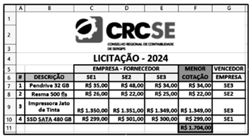• Em F7, foi inserida uma fórmula usando a função MENOR, que determina a menor cotação entre todas nas células C7, D7 e E7. Em seguida, essa fórmula foi copiada para F8, F9 e F10. • Em G7, foi inserida uma fórmula usando a função SE, que mostra a empresa vencedora do item, com base na comparação entre a menor cotação e as cotações fornecidas pelas empresas, usando o conceito de referência absoluta. Para finalizar, a fórmula inserida em G7 foi copiada para G8, G9 e G10.