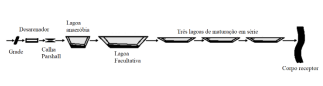 Dependendo da escolha do projetista e dos reatores utilizados, os esgotos e águas residuais podem ser tratados a diferentes níveis. A figura mostra o fluxograma composto por grade, desarenador, calha Parshall, lagoa anaeróbia, lagoa facultativa e três lagoas de maturação em série, dimensionado com o objetivo de desinfectar patogênicos do efluente.