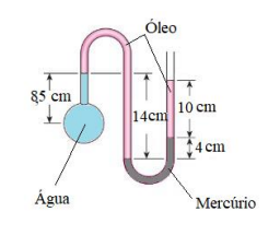 Sabe-se que o peso específico da água é de ϒágua = 9.800 N/m3 , o peso específico do óleo é de ϒóleo = 7.800 N/m3 e o peso específico do mercúrio é de ϒHg = 133.500 N/m3 . A carga de pressão relativa no ponto da tubulação onde está sendo realizada a tomada com o manômetro é de: