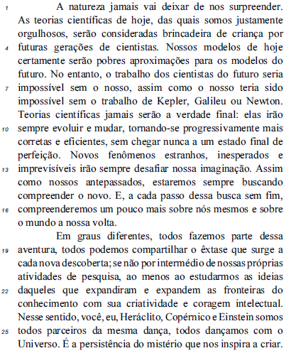No último parágrafo, o autor inclui a si mesmo, junto com Kepler, Galileu, Newton, Heráclito, Copérnico e Einstein, entre os cientistas que expandiram as fronteiras do conhecimento.
