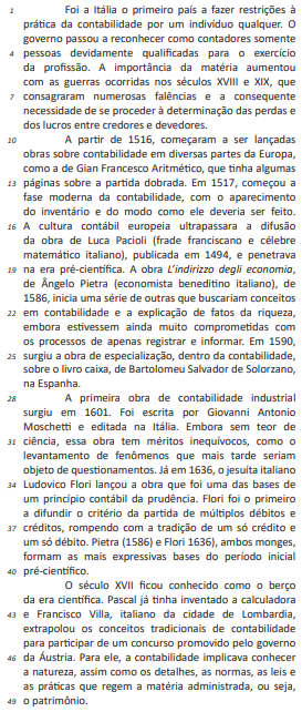 A partir da leitura do texto, é correto inferir que o país italiano teve grande importância no contexto da prática da contabilidade em meados dos séculos XV a XVII.