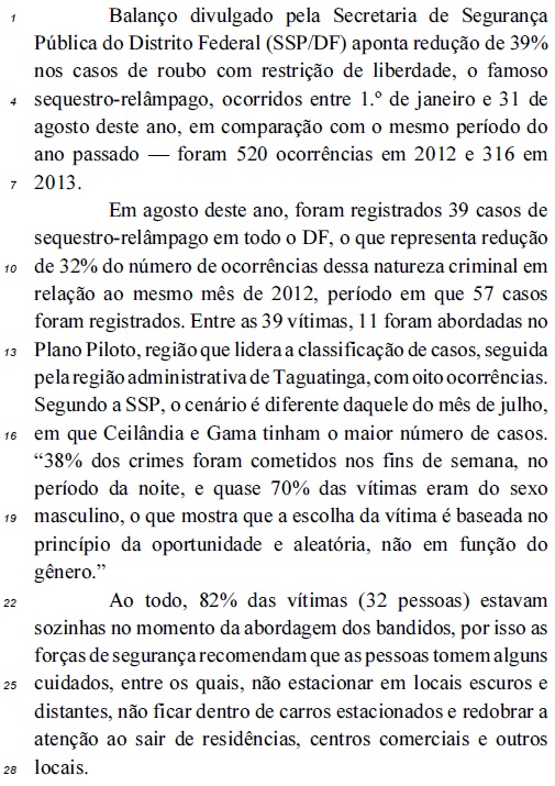 A correção gramatical e o sentido da oração “Em agosto deste ano, foram registrados 39 casos de sequestro-relâmpago em todo o DF” (l.8-9) seriam preservados caso se substituísse a locução verbal “foram registrados” por registrou-se .