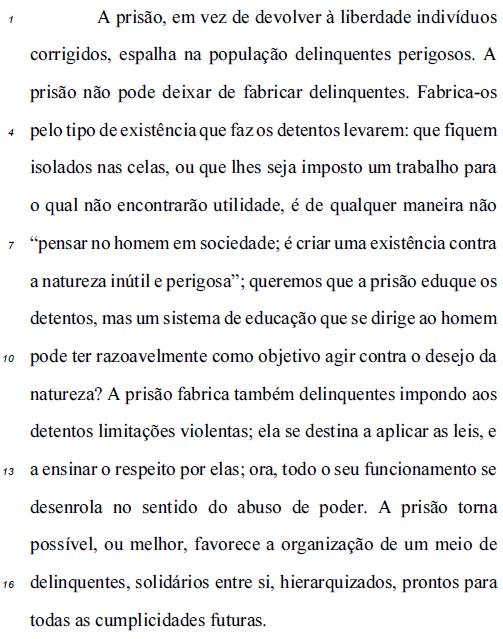 “A prisão (...) por elas” (l.11-13): Ao impor limitações violentas aos detentos, a prisão cria também delinquentes. Ela é destinada a aplicação das leis e ao ensino do respeito por elas.