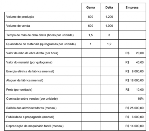 A indústria LuminaTech S.A. fabrica duas linhas de autopeças: Gama e Delta. Em março de 2024, a empresa fez o levantamento dos dados apresentados a seguir: