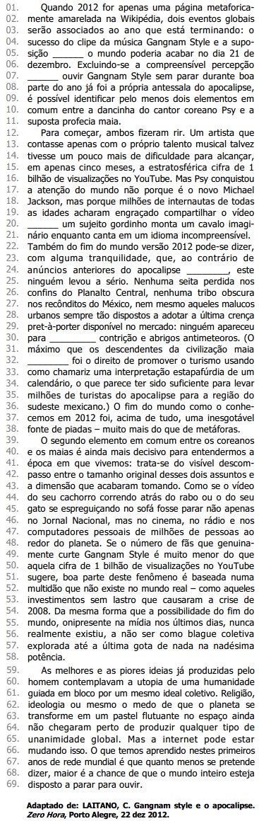 I - A utilização da expressão suposta (l. 11) indica a possibilidade de não haver uma profecia maia prevendo o fim do mundo em 2012.