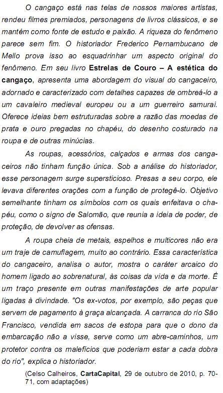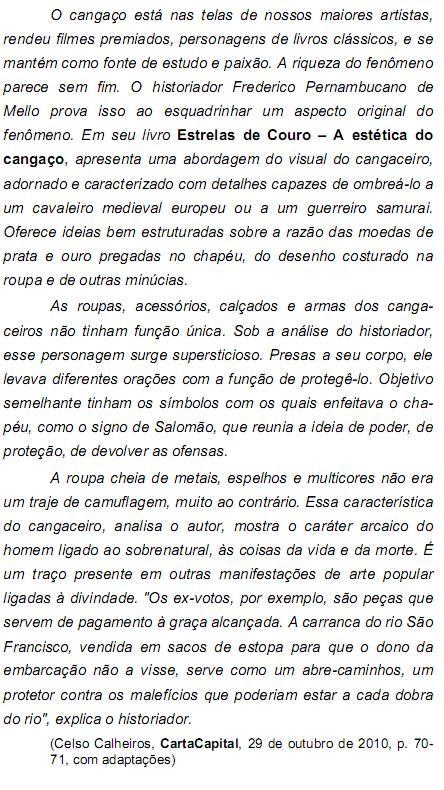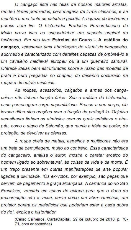 As questões de números 11 a 17 referem-se ao texto. ... apresenta uma abordagem do visual do cangaceiro, adornado e caracterizado com detalhes capazes de ombreá-lo a um cavaleiro medieval europeu ou a um guerreiro samurai. (1° parágrafo) O segmento grifado na frase acima pode ser substituído, mantendo-se o sentido e a correção, por: