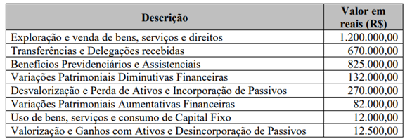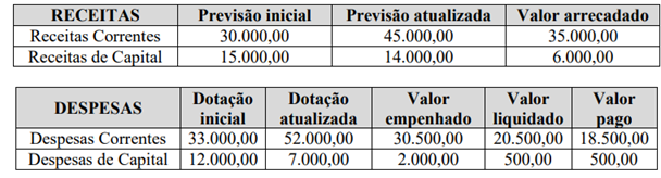 • Receita corrente prevista.....................R$ 1.800.000,00 • Receita de capital prevista.................. R$ 600.000,00 • Receita corrente realizada.................. R$ 1.250.000,00 • Receita de capital realizada.................R$ 230.000,00