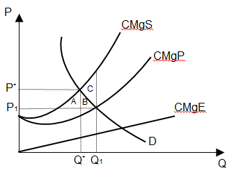Essa figura representa o resultado de equilíbrio de um mercado qualquer, no qual existem externalidades negativas no processo produtivo. As curvas CMgS, CMgP e CMgE representam, respectivamente, o custo marginal social, o custo marginal privado e o custo marginal externo e D é a curva de demanda de mercado. Qual das áreas em destaque corresponde ao custo de ineficiência gerado à sociedade?