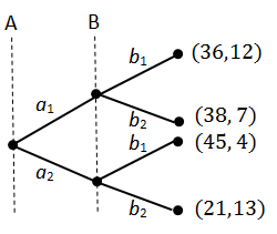 No primeiro nó à esquerda, a empresa A decide entre a estratégia a1 ou a2. Nos dois seguintes, a empresa B decide entre as estratégias b1 e b2. Os retornos de cada estratégia estão entre parênteses, ao final de cada combinação de estratégias, em que o retorno de A fica à esquerda e o de B, à direita. Suponha que os jogadores tentem maximizar seus ganhos e conheçam todos os retornos, as estratégias e a estrutura do jogo. Nessa situação a solução do jogo será a combinação de estratégias
