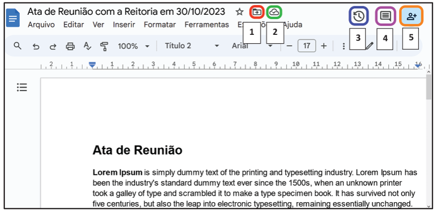 “O ícone referente ao número ____________________ tem a função de mostrar se e como o documento está sendo compartilhado com outros usuários, além de permitir alterar as configurações de compartilhamento. Já o ícone numerado com ____________________ mostra se todas as alterações feitas no documento estão salvas. O ícone cujo número é ____________________ permite mover o documento para um diretório na nuvem. Enquanto o ícone referente ao número ____________________ abre o histórico de comentários, o ícone número ____________________ abre o histórico de versões do documento”.