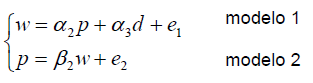 onde w =variação no salário e p=variação no preço são variáveis endógenas; d=taxa de desemprego é variável exógena; e1 e e2 são erros aleatórios com média zero, variância constante, não autocorrelacionados e Cov(e1 , e2)=0.