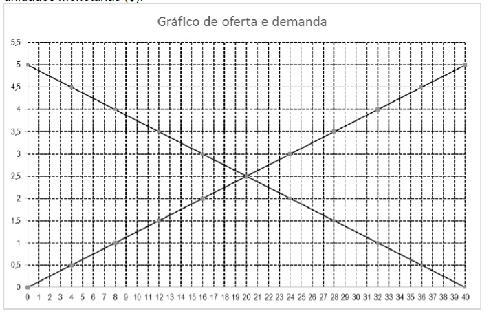 Observe abaixo um gráfico típico de oferta e demanda de um mercado competitivo, onde o eixo da abcissa representa a quantidades unidades (u) e o eixo da ordenada, os preços em unidades monetárias ($).