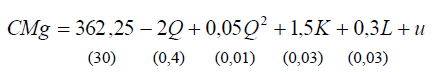 que relaciona os Custos Marginais ( CMg ) em reais R$ em função da Quantidade Produzida ( Q ) em unidades, a quantidade de Capital ( K ) em número de máquinas utilizadas e a quantidade de trabalho ( L ) em número de funcionários utilizados. Com objetivo de analisar os CMg de 500 empresas de mesmo porte, um economista estimou o modelo e os resultados foram: