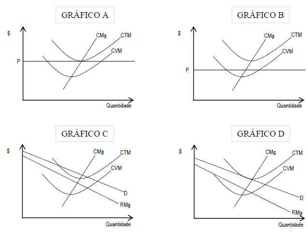 Os gráficos abaixo representam as possibilidades de lucro de estruturas típicas de mercado. Define-se: CMg (Custo Marginal), CTM (Custo Total Médio), CVM (Custo Variável Médio, RMg (Receita Marginal), D (Demanda) e P (Preço).